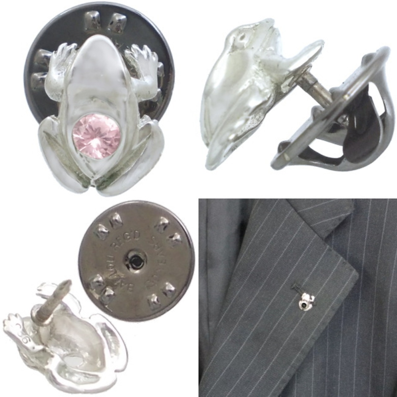 (10月)ピンクトルマリン ホワイト フロッグ シルバーピンバッジ ピンズ 誕生石*BK-1141