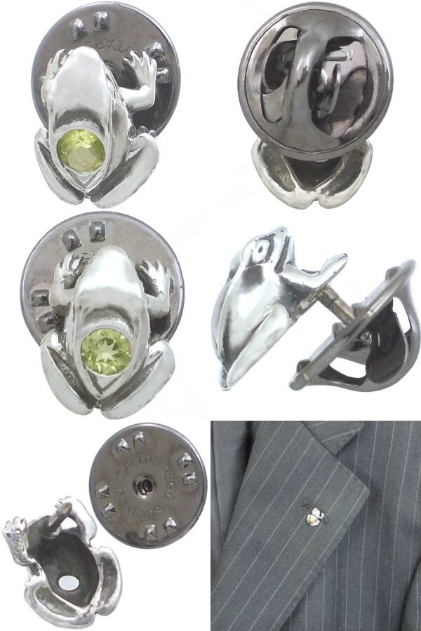 (8月)ペリドット ブラック フロッグ シルバーピンバッジ ピンズ 誕生石*BK-1143