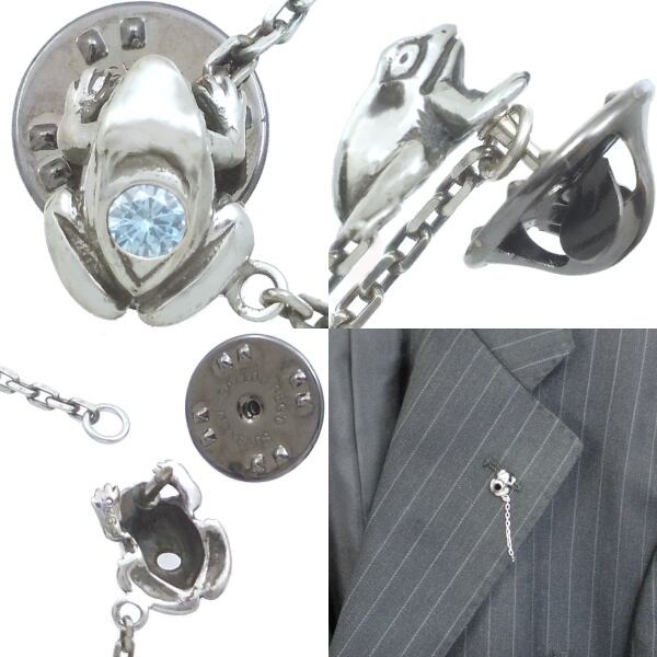 (3月)アクアマリン ブラック フロッグ チェーン シルバーピンバッジ ピンズ 誕生石*BK-1144