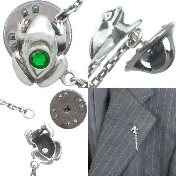 (5月)エメラルドグラス ブラック フロッグ チェーン シルバーピンバッジ ピンズ 誕生石*BK-1144