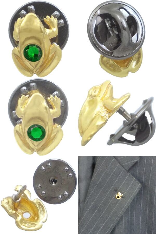 (5月)エメラルドグラス ブラック フロッグ シルバーピンバッジ ピンズ 誕生石*BK-1145