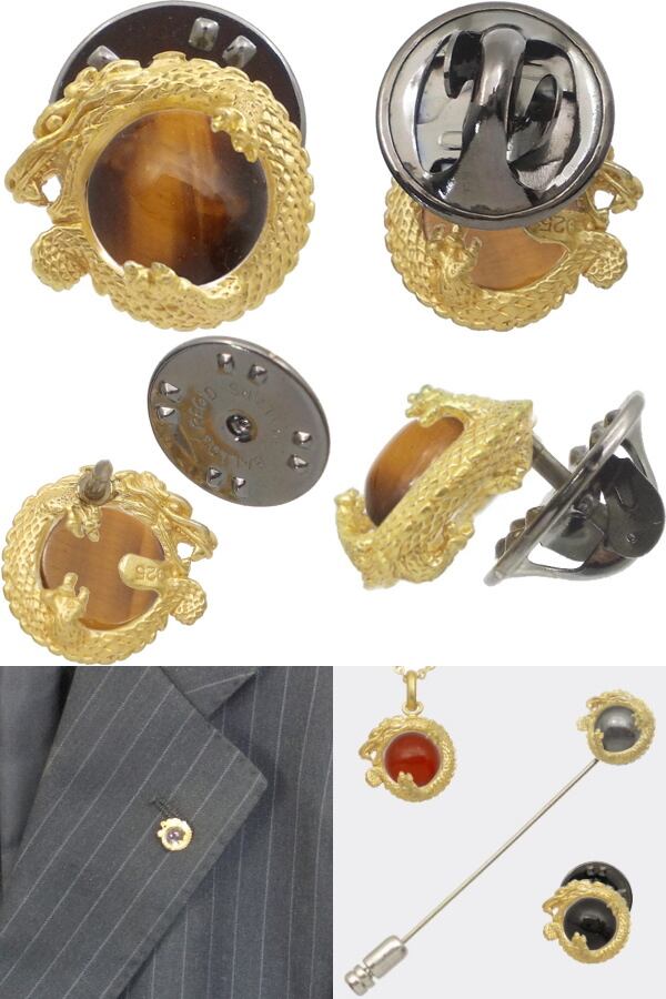 パワーの宿る天然石をシッカリと掴むセラミックゴールドコーティングのドラゴンが一際目を引くピンバッヂ。その強力なパワーで運気をもたらす象徴としても知られる龍と多様なストーンバリェーションとのコンビが楽しめるリアルなドラゴン&ストーン。
