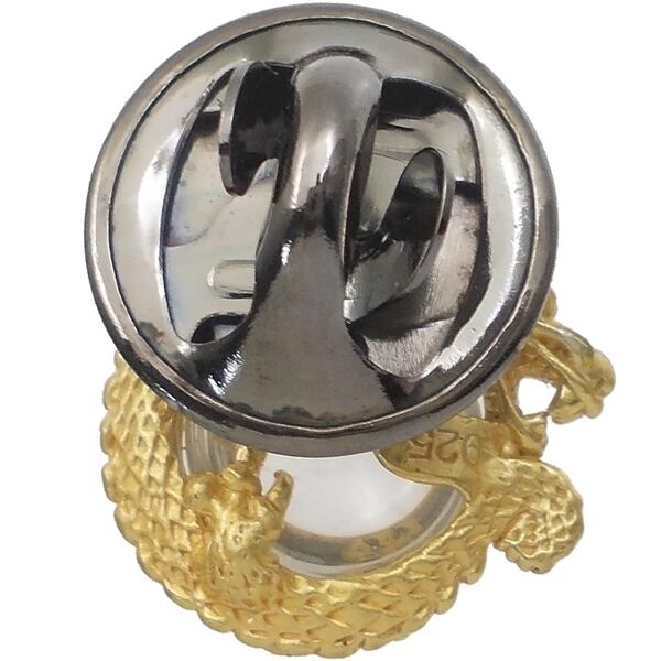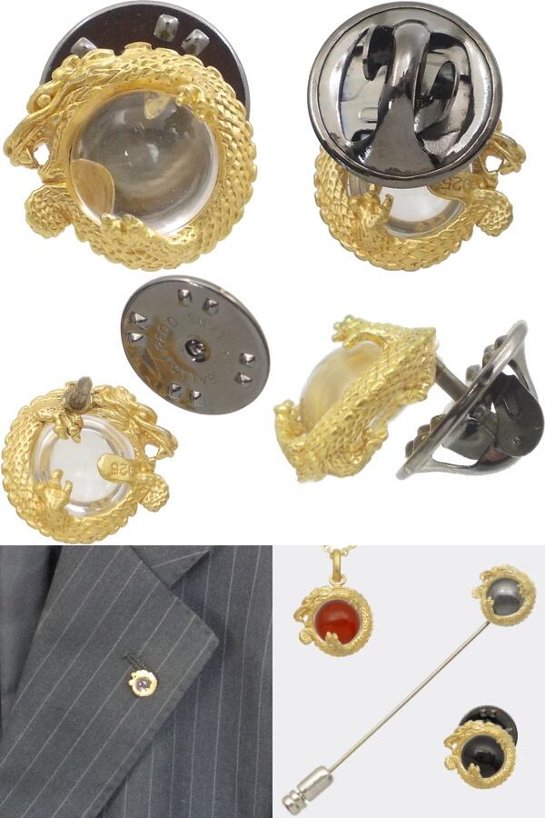 パワーの宿る天然石をシッカリと掴むセラミックゴールドコーティングのドラゴンが一際目を引くピンバッヂ。その強力なパワーで運気をもたらす象徴としても知られる龍と多様なストーンバリェーションとのコンビが楽しめるリアルなドラゴン&ストーン。