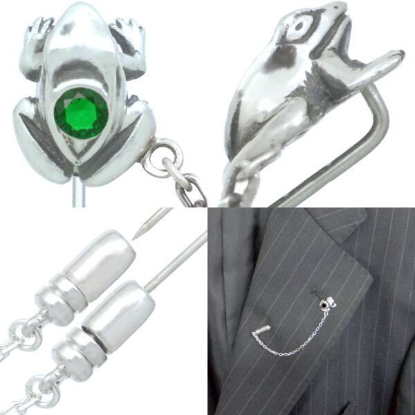 (5月)エメラルドグラス ブラック フロッグ チェーン シルバーラペルピン 誕生石*BK-1242