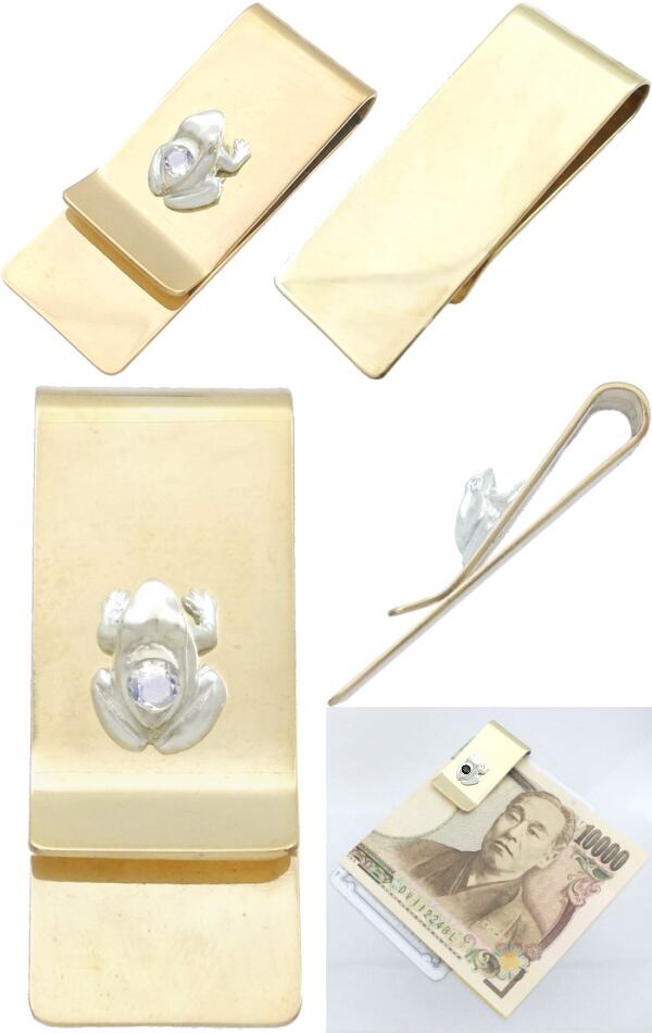 ★ホワイト仕上げと燻し仕上げのシルバーのカエルに誕生石をセッティングしたブラスマネークリップ。。
