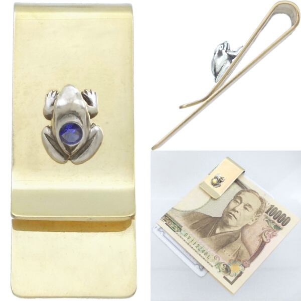 ★ホワイト仕上げと燻し仕上げのシルバーのカエルに誕生石をセッティングしたブラスマネークリップ。。