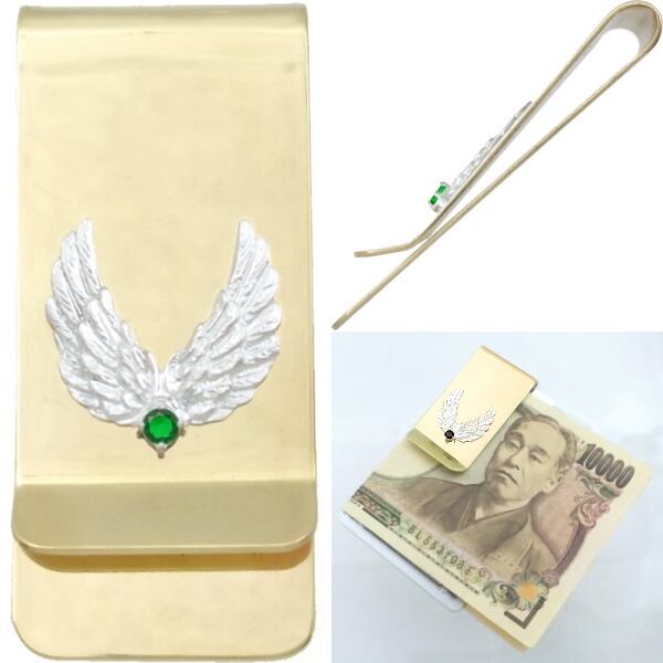 ★2枚の翼が開くウイングモチーフとバースデーストーンのブラスボディマネークリップ。