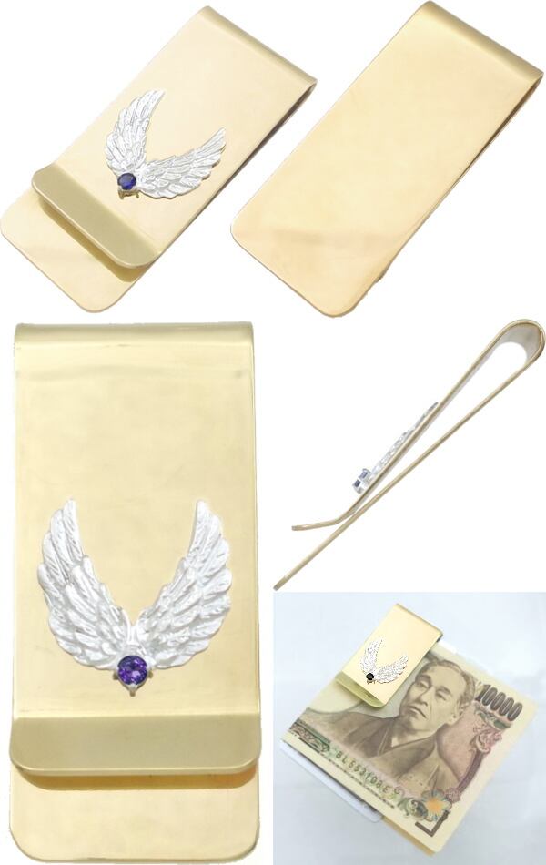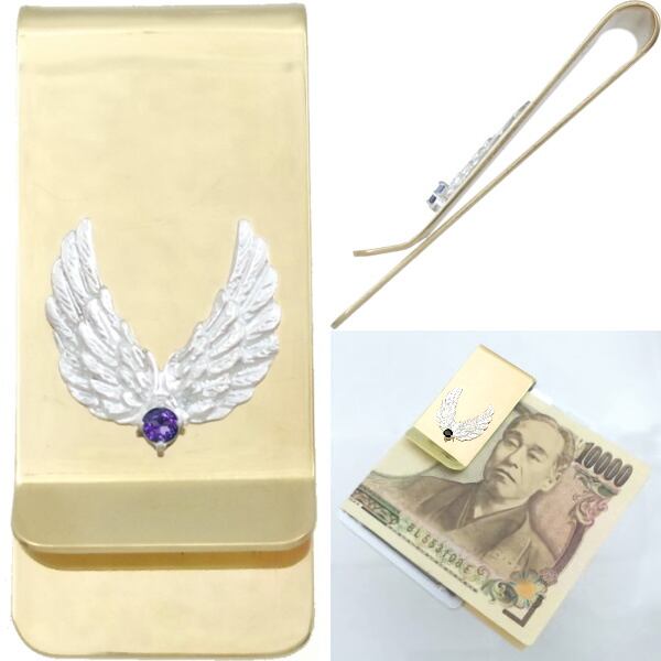 ★2枚の翼が開くウイングモチーフとバースデーストーンのブラスボディマネークリップ。