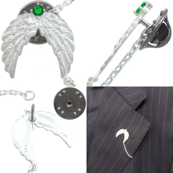 (5月)エメラルドグラス ホワイト エンジェル ウイング チェーン シルバーピンバッジ ピンズ 誕生石*BK-1148