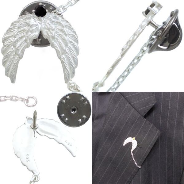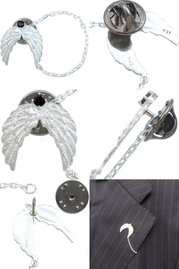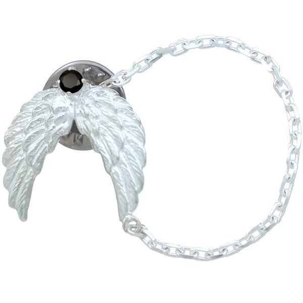 ブラックCZ ホワイト エンジェル ウイング チェーン シルバーピンバッジ ピンズ*BK-1148