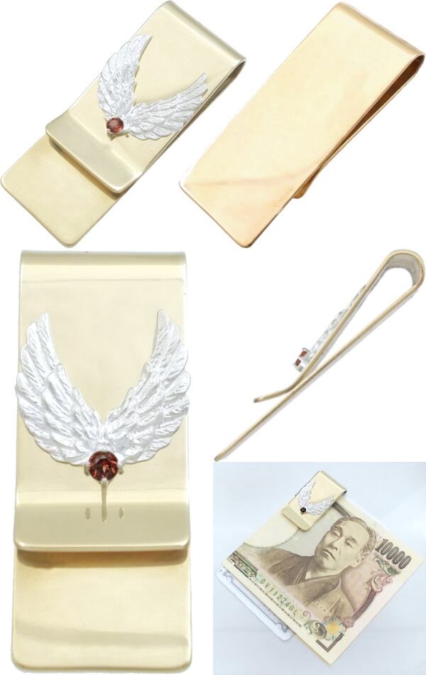 ★2枚の翼が開くウイングモチーフとバースデーストーンのブラスボディマネークリップ。