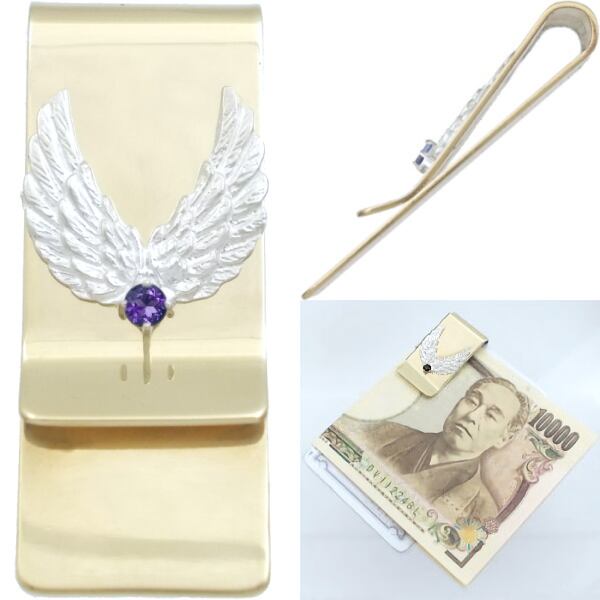 ★2枚の翼が開くウイングモチーフとバースデーストーンのブラスボディマネークリップ。