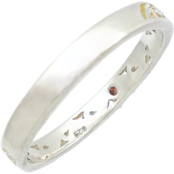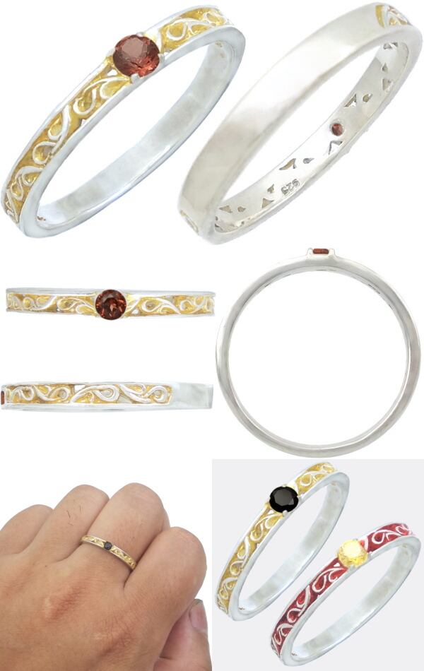 シンプルな唐草デザインに誕生石をセッティングした細身のリング。従来のホワイトとブラック仕上げに追加されたゴールドとレッドの鮮やかな差し色が目を引く新感覚のラインナップ。