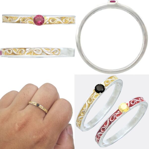 シンプルな唐草デザインに誕生石をセッティングした細身のリング。従来のホワイトとブラック仕上げに追加されたゴールドとレッドの鮮やかな差し色が目を引く新感覚のラインナップ。