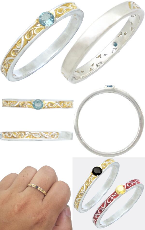 シンプルな唐草デザインに誕生石をセッティングした細身のリング。従来のホワイトとブラック仕上げに追加されたゴールドとレッドの鮮やかな差し色が目を引く新感覚のラインナップ。