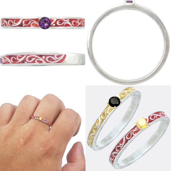 シンプルな唐草デザインに誕生石をセッティングした細身のリング。従来のホワイトとブラック仕上げに追加されたゴールドとレッドの鮮やかな差し色が目を引く新感覚のラインナップ。