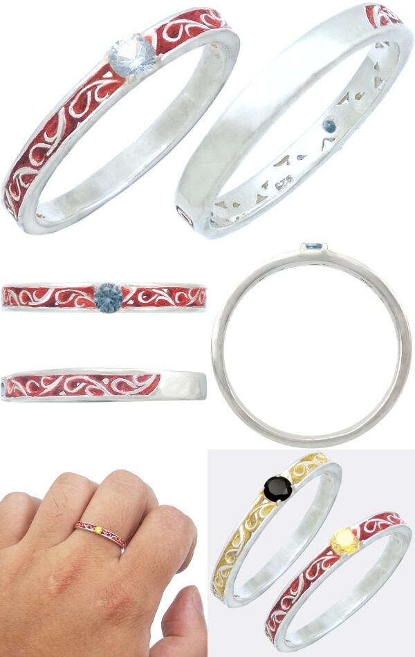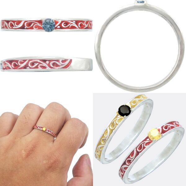 シンプルな唐草デザインに誕生石をセッティングした細身のリング。従来のホワイトとブラック仕上げに追加されたゴールドとレッドの鮮やかな差し色が目を引く新感覚のラインナップ。