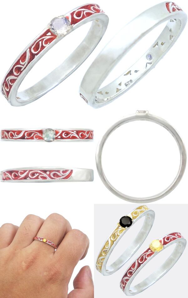 シンプルな唐草デザインに誕生石をセッティングした細身のリング。従来のホワイトとブラック仕上げに追加されたゴールドとレッドの鮮やかな差し色が目を引く新感覚のラインナップ。