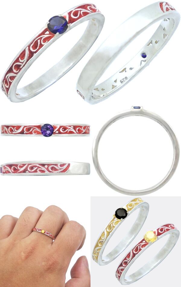 シンプルな唐草デザインに誕生石をセッティングした細身のリング。従来のホワイトとブラック仕上げに追加されたゴールドとレッドの鮮やかな差し色が目を引く新感覚のラインナップ。