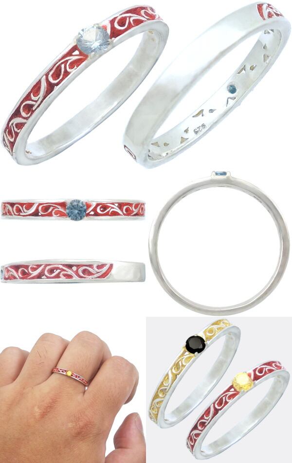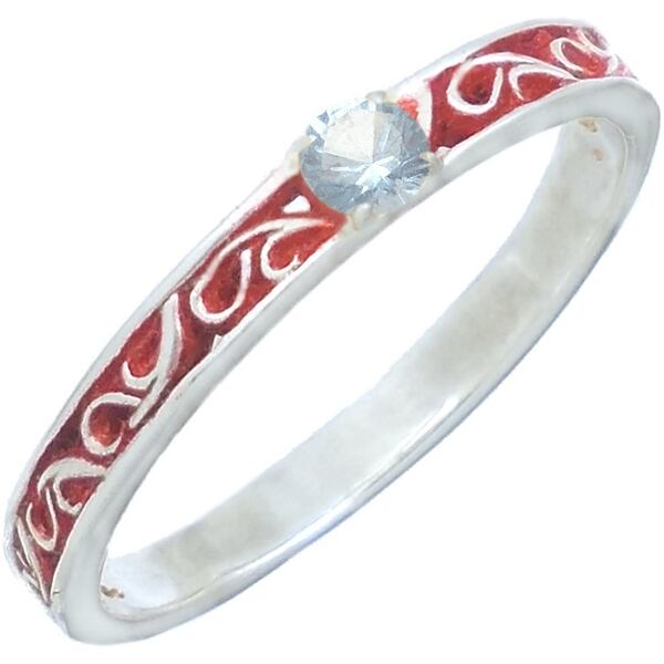 シンプルな唐草デザインに誕生石をセッティングした細身のリング。従来のホワイトとブラック仕上げに追加されたゴールドとレッドの鮮やかな差し色が目を引く新感覚のラインナップ。
