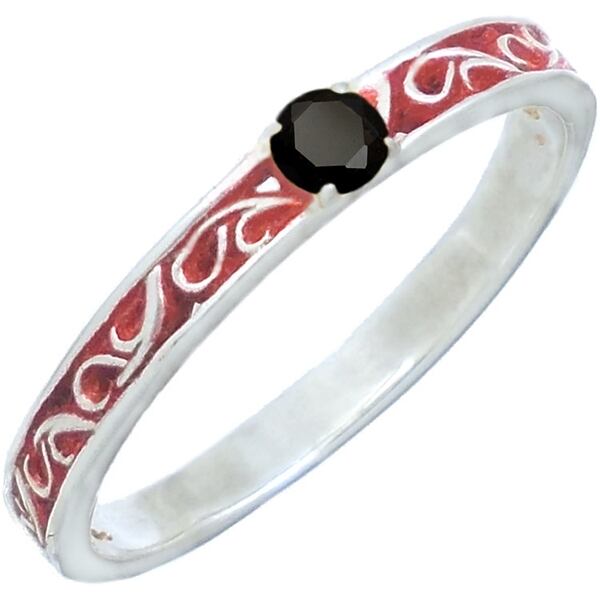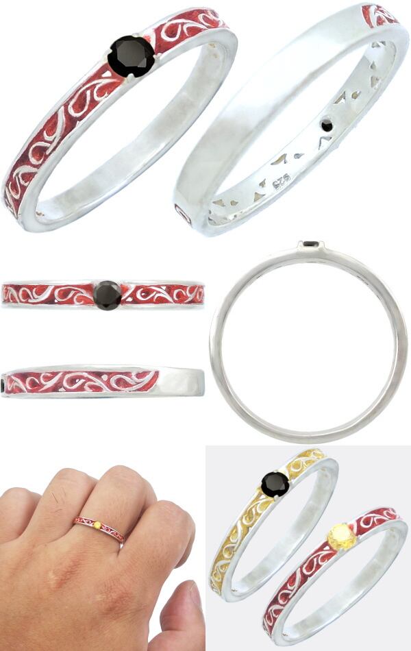 シンプルな唐草デザインに誕生石をセッティングした細身のリング。従来のホワイトとブラック仕上げに追加されたゴールドとレッドの鮮やかな差し色が目を引く新感覚のラインナップ。