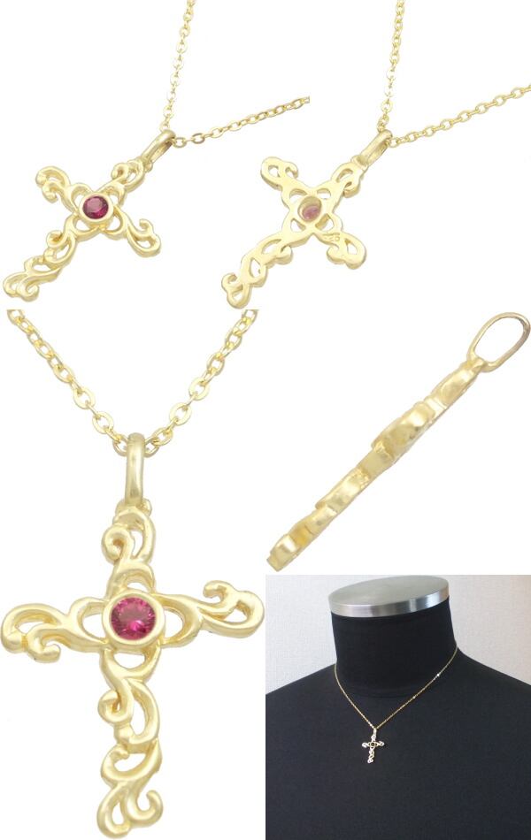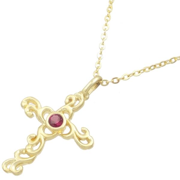 (7月)ルビー ゴールドコート アラベスク クロス シルバーチャームネックレス 誕生石*BP-1095