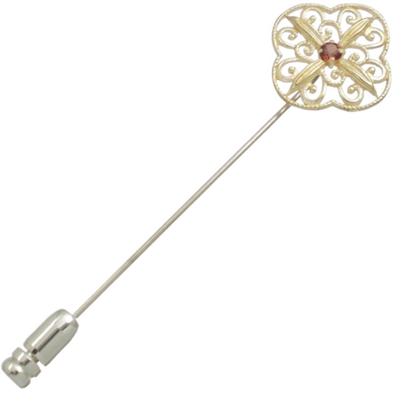 気品のあるスクロールに囲まれたクロスモチーフの誕生石をあしらったラペルピン。シルバーにゴールドセラミックをコーティングしたバージョンはより華やかで目を引く存在。