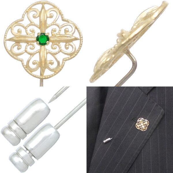 (5月)エメラルドグラス ゴールドコート オリエント クロス シルバー ラペルピン 誕生石*BK-1268