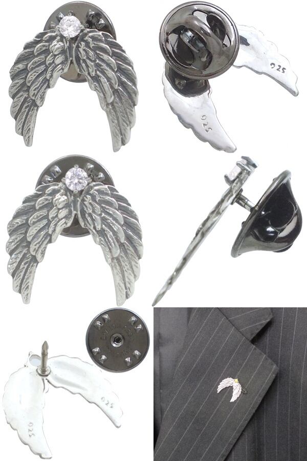 (4月)ジルコニア ブラック エンジェル ウイング シルバーピンバッジ ピンズ 誕生石*BK-1150