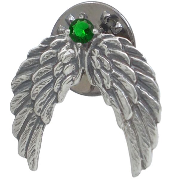 (5月)エメラルドグラス ブラック エンジェル ウイング シルバーピンバッジ ピンズ 誕生石*BK-1150